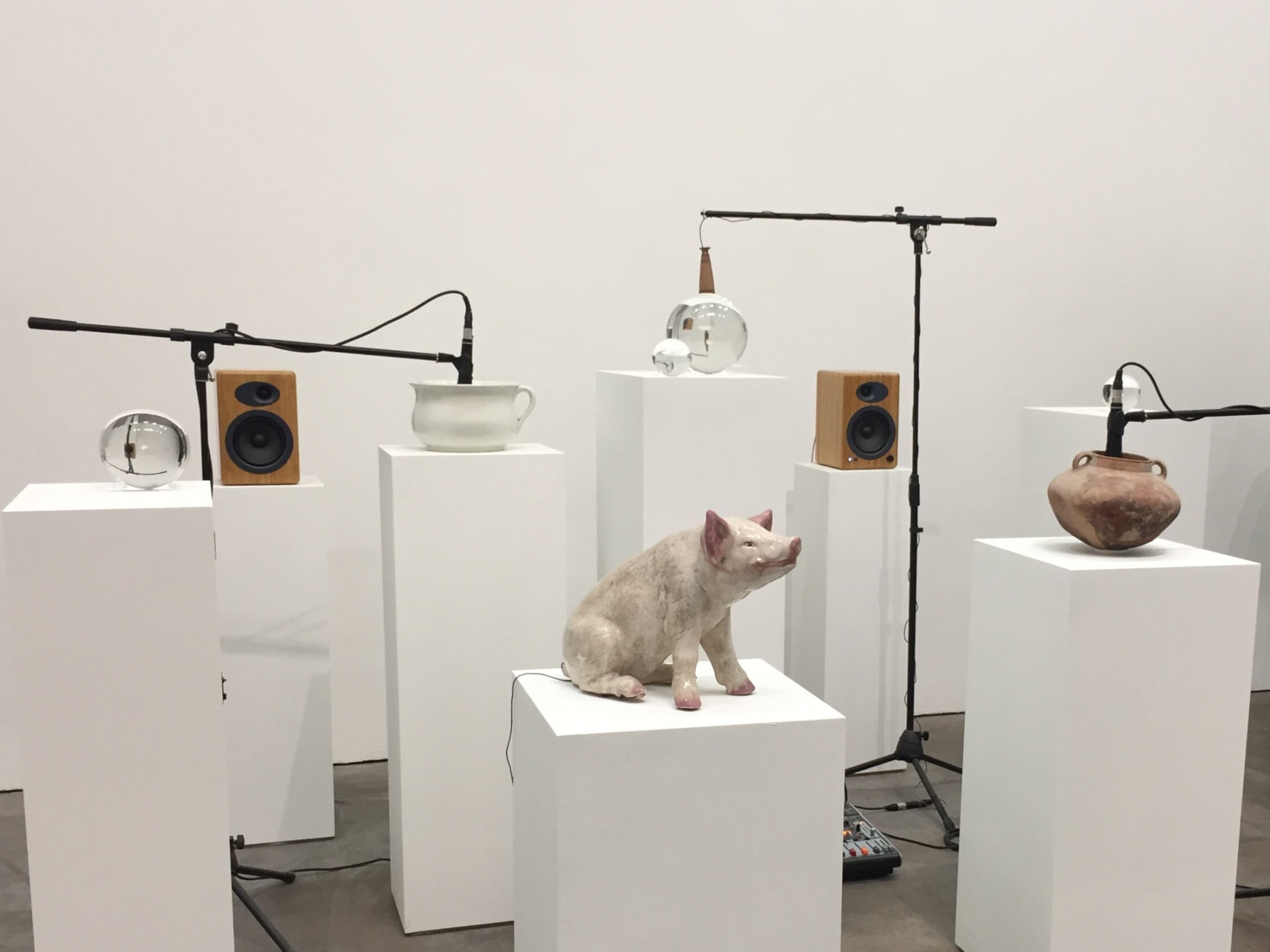 For the visual part, the Making Tristan includes some readymade objects such as a pig sculpture with a glossy finish, a clay vase and pot, and some glass balls, along with a pair of speakers and three sets of microphone, as the image above is shown. However, the sound is also an important element in constructing this piece of art.