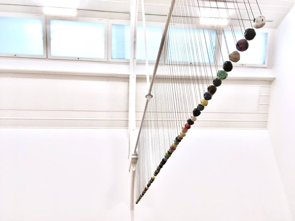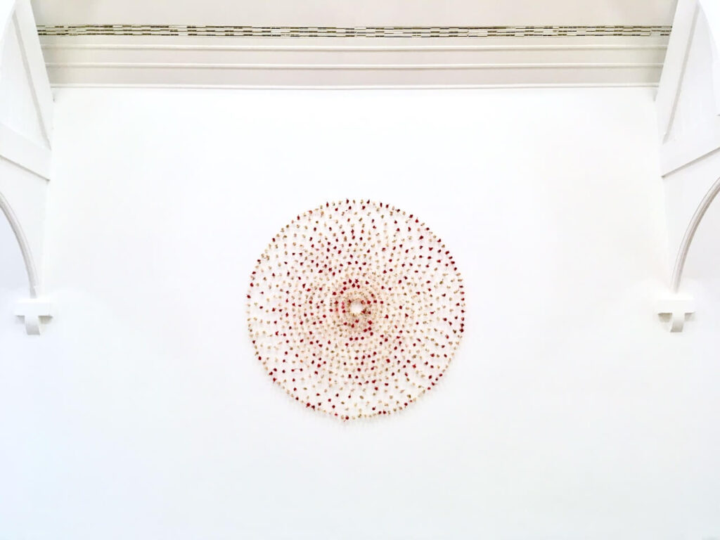 There were some noticeable common elements among the exhibiting artworks. The shape of “Circle” can be seen in various artworks in this exhibition: for example, the ceramic artworks with various designs, the neat circle-shaped paper flowers installation, the digital installation projecting the paper flowers installation work, the circle pattern of rug series in the shape of a square, also, the painted circles on paper installed on the wall, and the ceramic beads. Besides, the significant use of colours: pink, red, orange, yellow, light green, green, blue, and purple can be seen throughout the exhibition, and be specific in many artworks: all the exhibiting rugs, the main gallery acrylic-painted wall with words, and painted 77 designs of the circle in rectangle papers, and the painted wall which is part of the “Halfpipe”.