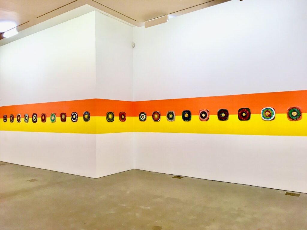 Approximately 100 various designs, which involving colours and textures of ceramic artworks in almost identical size (12 x 12 inches) placed horizontally on each of the sidewalls, and the orange and yellow acrylic-painted stripes which is the same height level as the orange and yellow in the centre wall.