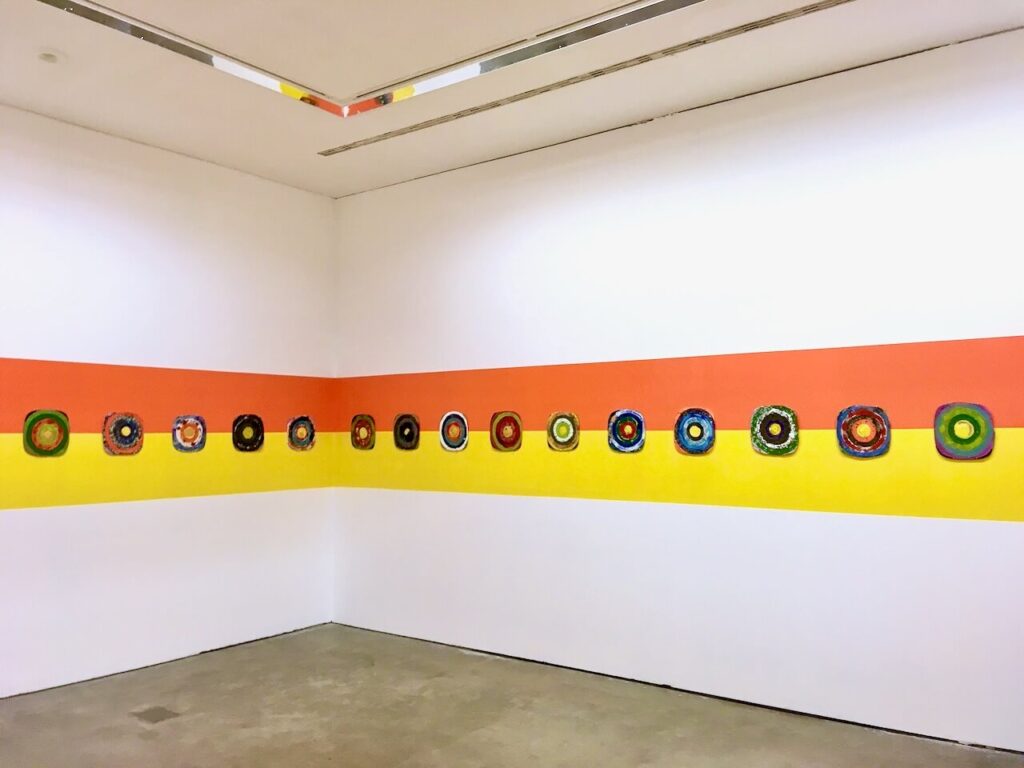 In another room, there was one more the same square rug series but with red edges. And there were 77 individual rectangle paper circle designs painted in a combination of different colours, they were placed neatly, and corresponded with the rug.