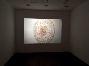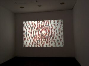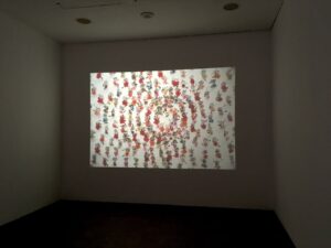 A digital installation art continuously projecting frames referring to the wall of handmade paper flowers in mandala style of installation in a room of dim light.