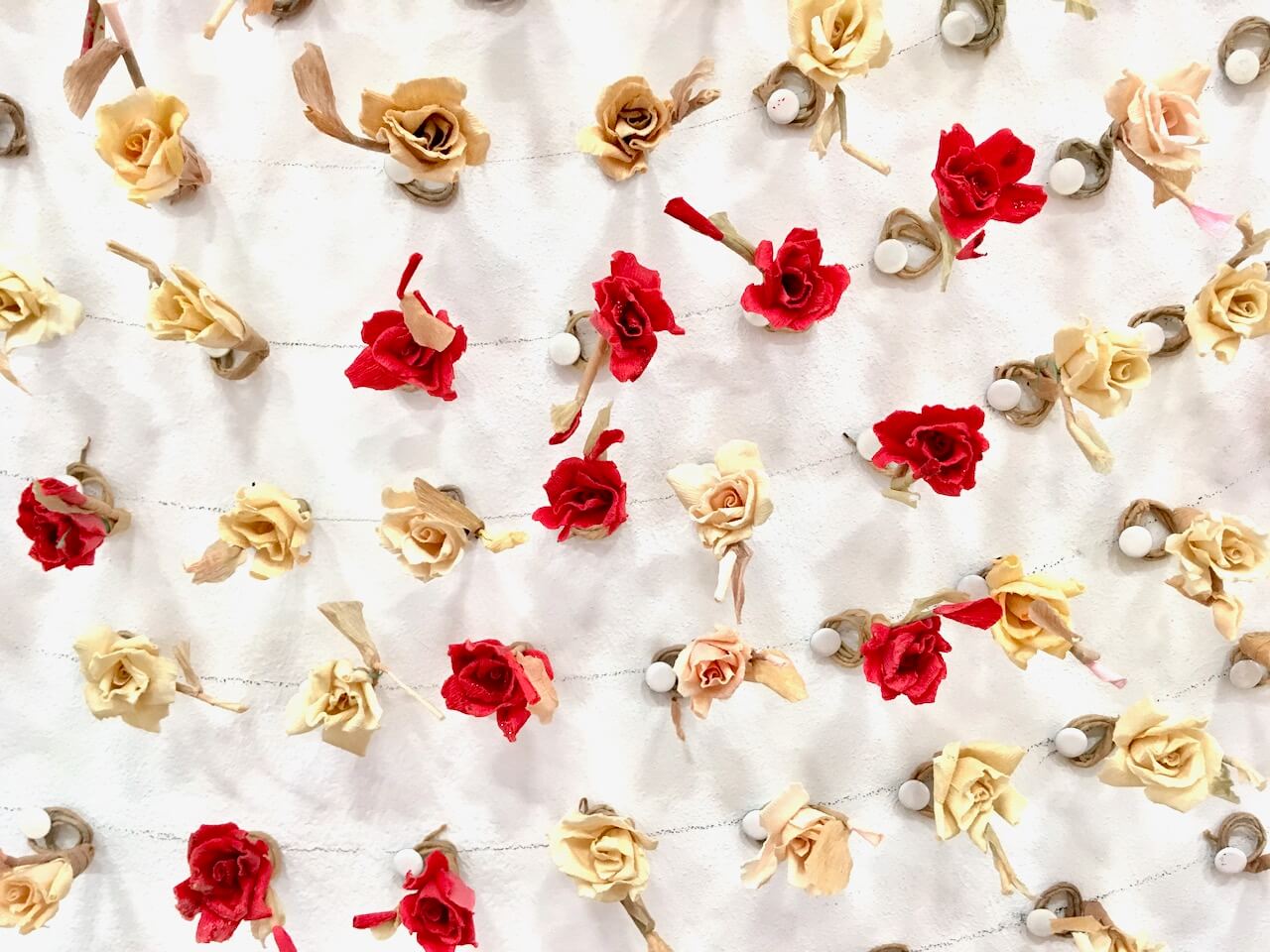 The fake (paper) flowers were all handmade and it was first used on Apfelbaum’s work of exhibition in 1990 and re-used as the Wallflowers (Mixed emotions) installation in 2018. Apfelbaum didn’t re-touch the fake (paper) flowers to present the nature of flaws caused by ageing.