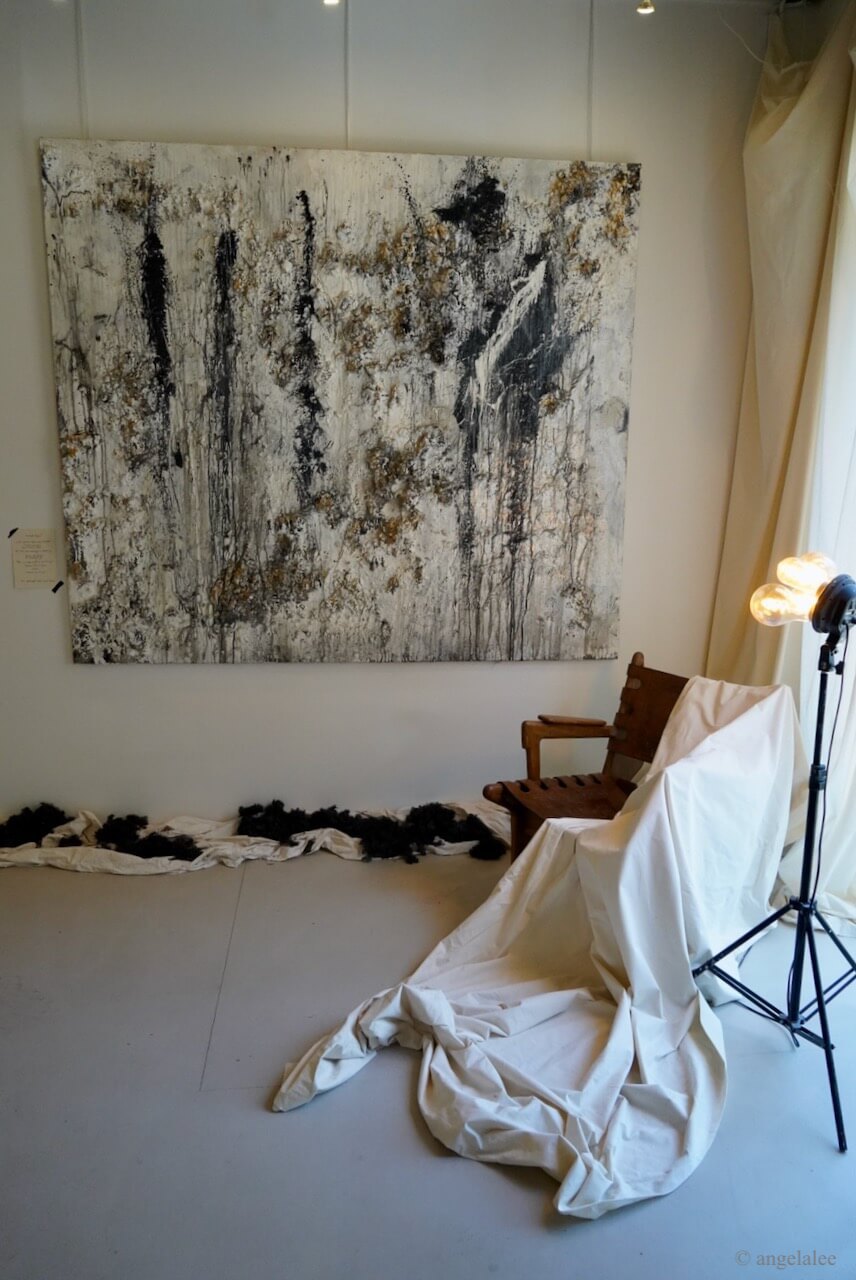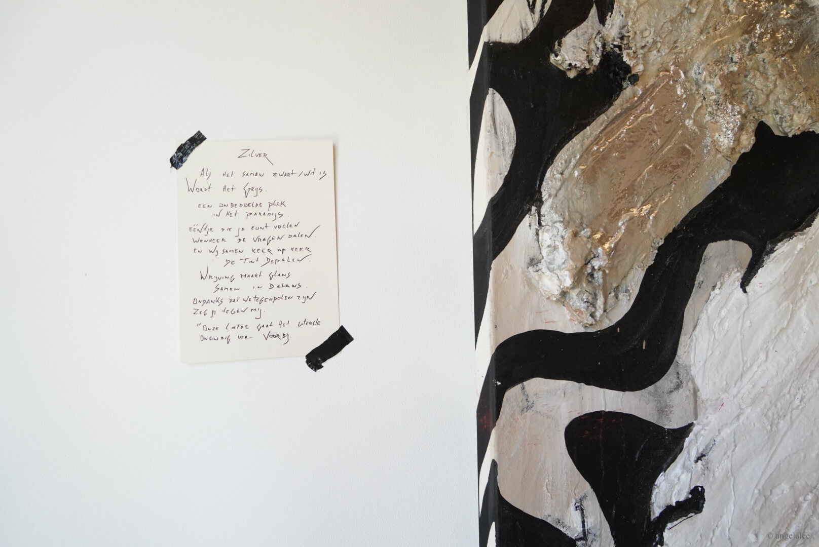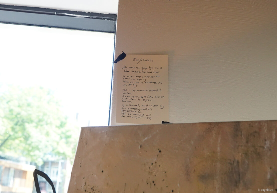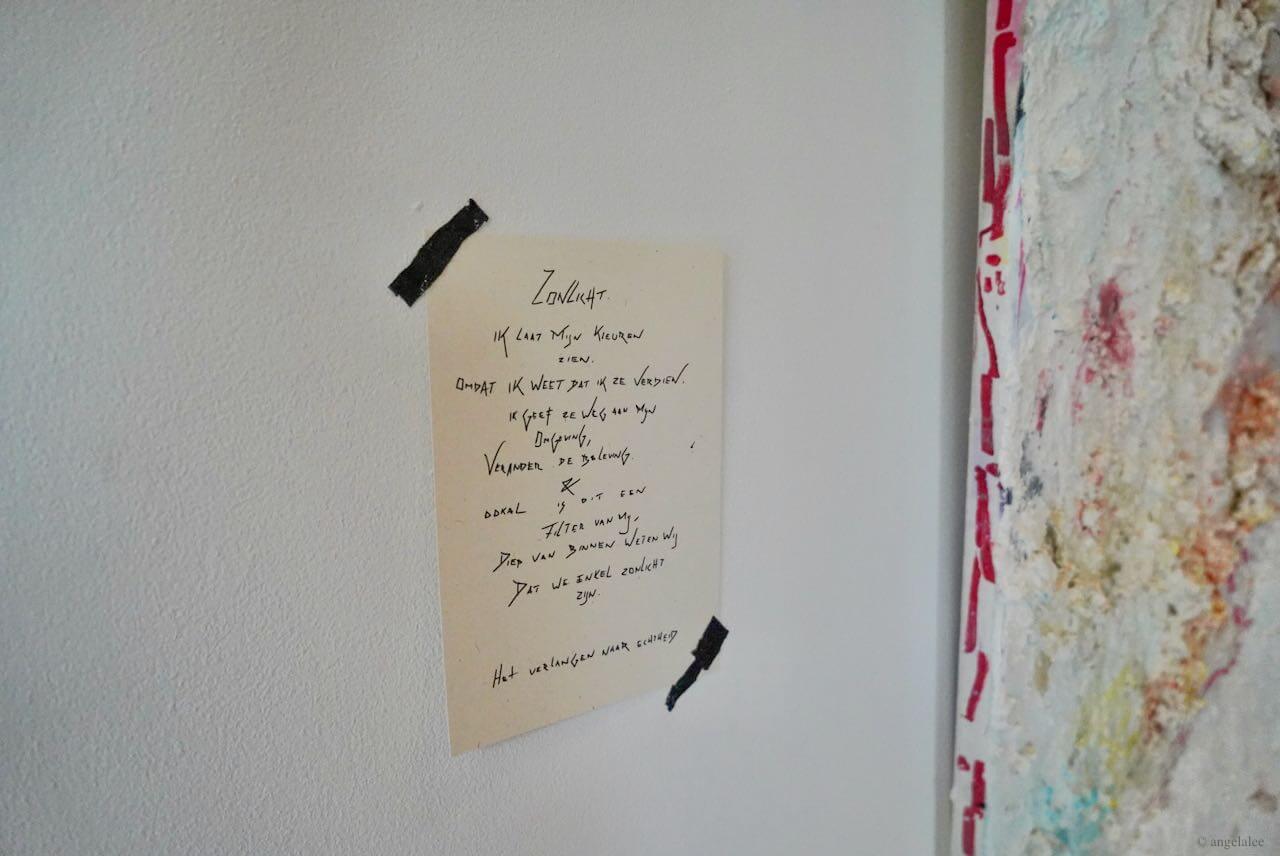 It showcases artist Roos Dessing’s paintings and poetry in Dutch which works as descriptions on the side of the paintings. The series of abstract mixed media paintings are inspired by human connections from brief to intimate levels involving the stages of strangers, different levels of friendship, and the romantic one. Roos describes it as different layers in us, and there are applied meanings of her choice of colors, white represents her as a subject, and black represents her vulnerability. White, black, or grey pigments are heavily used throughout her practices as the medium of epoxy, sharpie pen, and some hints of blue, pink, gold, and green. Her painting style is full of texture