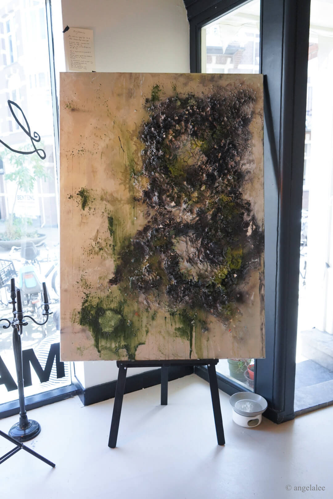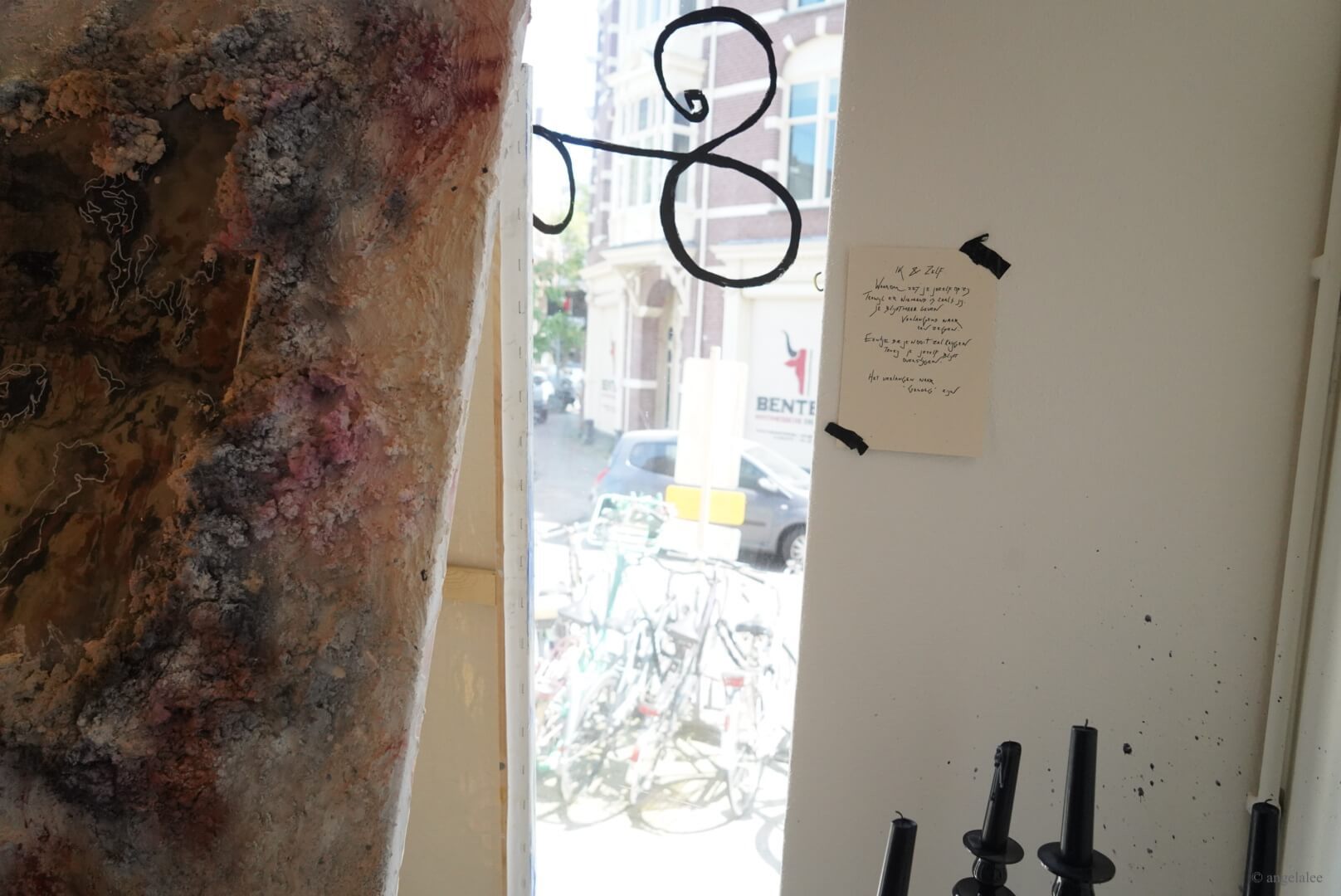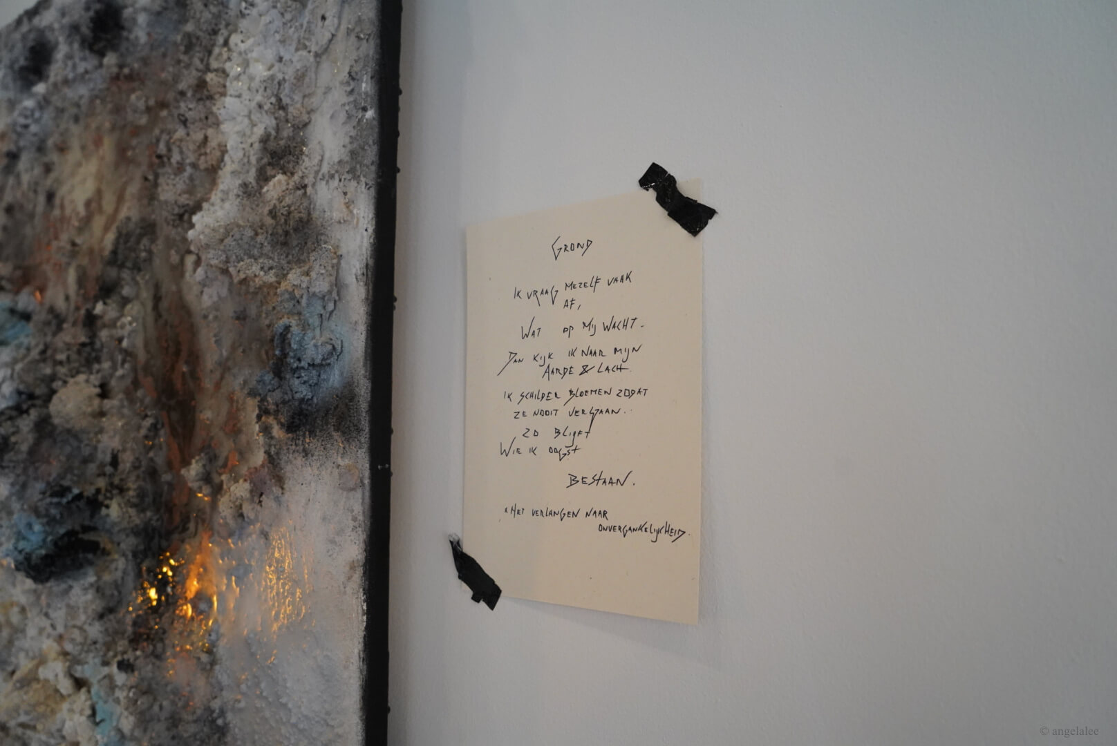 It showcases artist Roos Dessing’s paintings and poetry in Dutch which works as descriptions on the side of the paintings. The series of abstract mixed media paintings are inspired by human connections from brief to intimate levels involving the stages of strangers, different levels of friendship, and the romantic one. Roos describes it as different layers in us, and there are applied meanings of her choice of colors, white represents her as a subject, and black represents her vulnerability. White, black, or grey pigments are heavily used throughout her practices as the medium of epoxy, sharpie pen, and some hints of blue, pink, gold, and green. Her painting style is full of texture