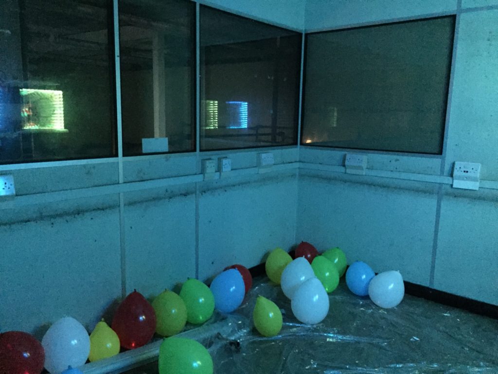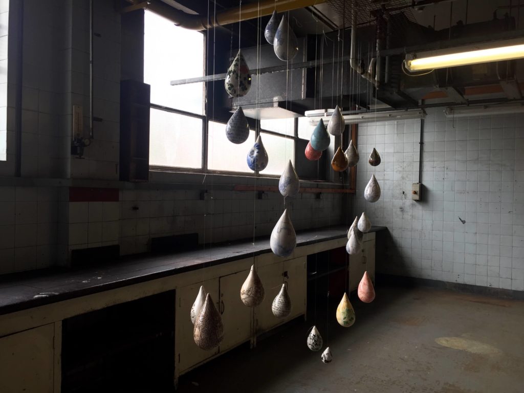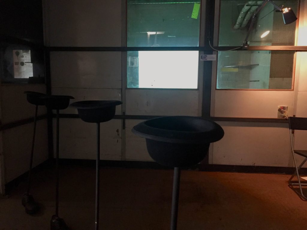 The installations below contain a variant of ‘found objects’ in the building. As the 2 images show below, the left-hand side has multiple painted tear-drop shaped objects suspended in the air at various heights, and the right image presents black hats attached on each stick lined up in a row.