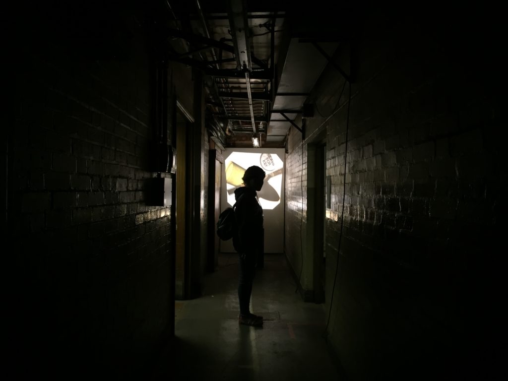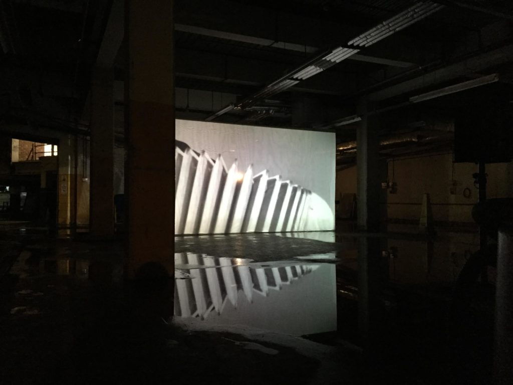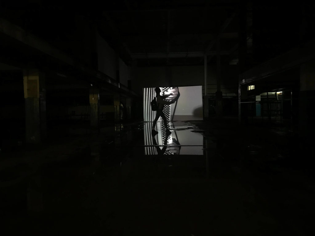 Images we see online are usually a form of re-presentation if they are not the originals. The idea of it involves the perspective of the person who is capturing and constructing the presentation through the angles, exposure, lighting, the use of added elements such as people, objects or filters. Besides, capturing images in a selected video time frame(s) or the choice of images to present a particular exhibition. Therefore, the images we see online presents a similar idea of an artwork in real form. Taking pictures is a form of creative practice, the original meaning could be changed or added through the lens. Take a series of images below as an example, there is a person standing in the middle of those images, I believe it is able to draw readers’ attention from the video installation art originally to the connection between the person and the artwork, or the person matters. The vision of I was imagining to capturing these images the way I wanted, I considered about the lighting, dark environment and the water on the ground which makes a reflection of the video images, and I believe it would make an interesting scene if a person is added in the middle, that is the reason I did.