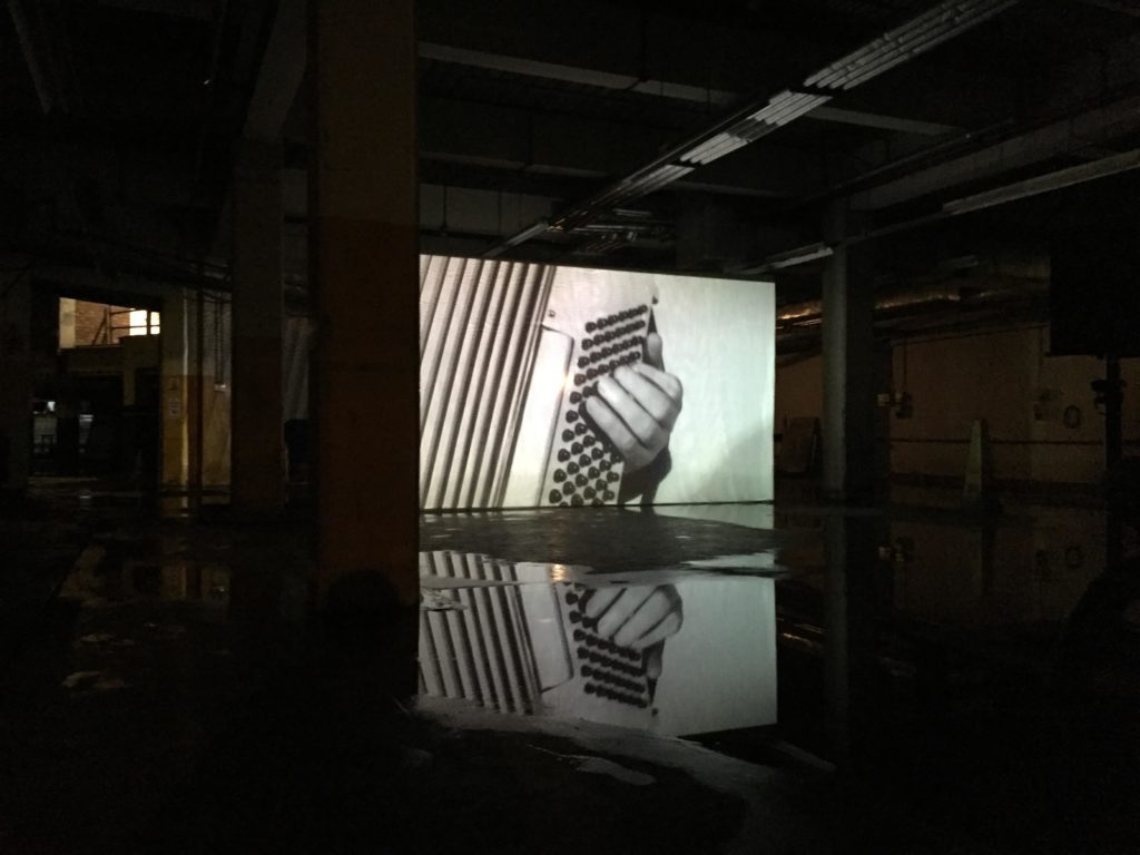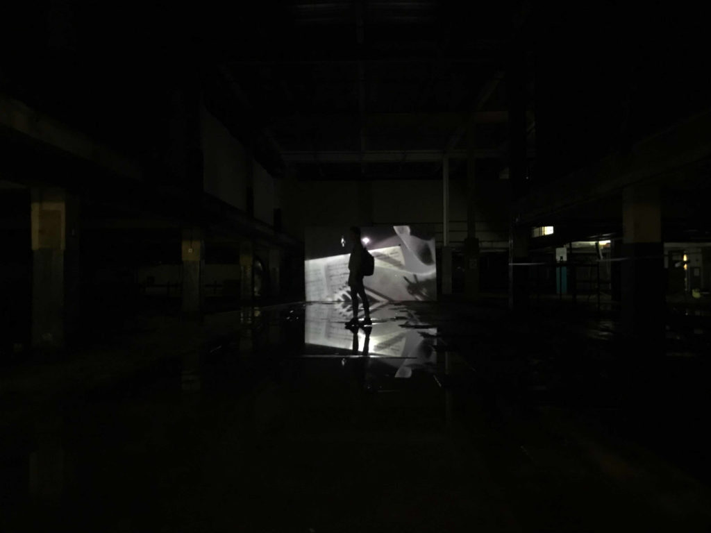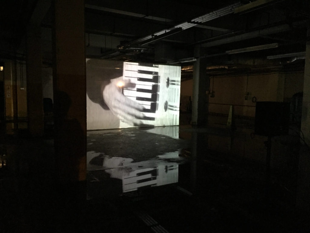 The images below show the biggest installation of mixed media art within the building. These screenings are related because there is a musician playing the aerophone. There are 3 big screens placed in the darkest area within the textualized open space, where you would be overwhelmed by the intense looped melody, accompanied by the duplicated moving images presented in different time frames.